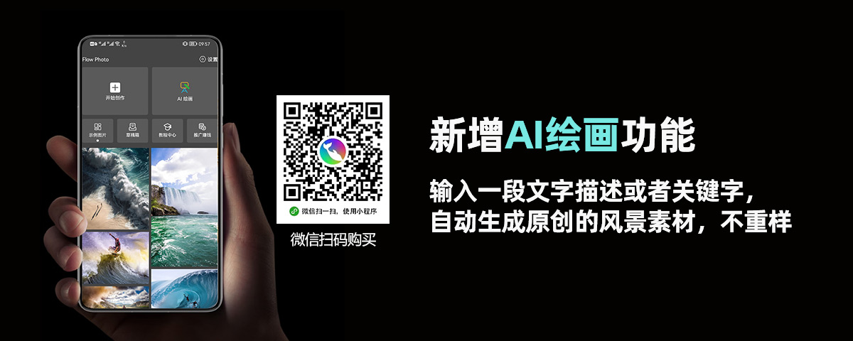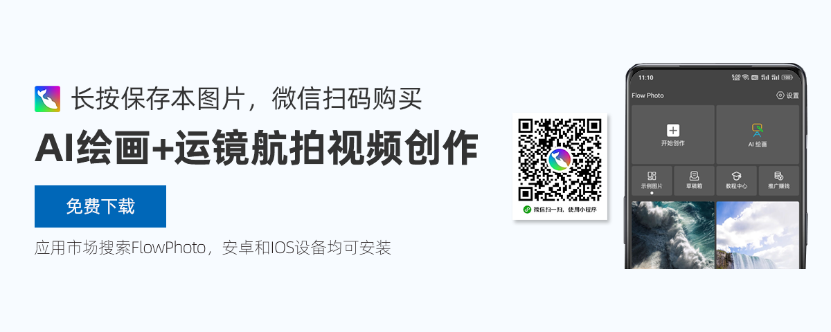 [FlowPhoto小海豚绘画?] Flow Photo(又称“小海豚”)是一款强大的图片和视频处理APP,它能让您的静态照片秒变延时摄影与航拍大片,同时支持AI绘画功能,实现从文本到照片再到视频的一站式操作。无论是流动的云、滚动的海面,还...