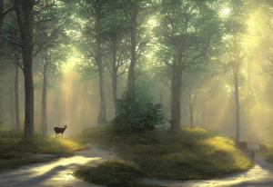 7、A deer standing at the end of the road inside a forest, a beam of light shine upon the deer, calm, peaceful, harmonious environment