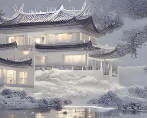 2、Chinese CG rendering surreal white villa, house built with snow, soft lighting, 3D lighting, color lighting, snow covered, snow covered path, pond, trees, silver white moon, petals falling, winter, snow scene, moon in the sky,HD –ar 9:16 –v 3