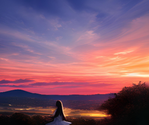 11、杰作,最好的作品,细节精致,高分辨率,最高画质,细节无限,绝美的日落,云朵在天空中飘浮。极致的美感,平行构图,高速快门。漂亮的女孩坐在大树下,她穿着一件白色的裙子,头发长长地披在身后。她正微笑着,眼神明亮。远景,阳光下的轮廓,柔和的光。