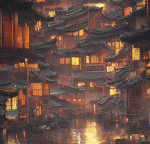 6、一轮清析的明月,江南水乡,水路,徽派建筑,灯光,大场景